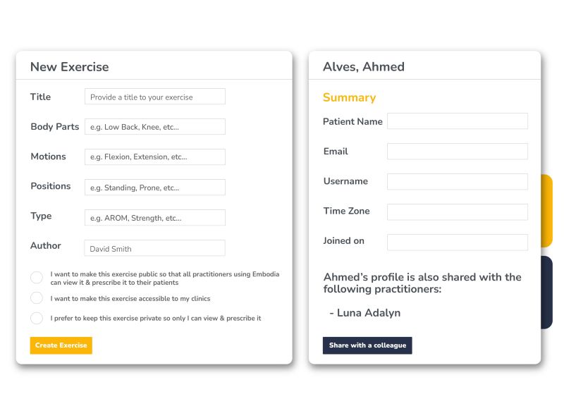 Create a clinic library of exercises,education, and questionnaires. Easily share patient profiles and collaborate on prescribed programs. Clinic managers have complete oversight of their account, including practitioner and patient statistics.